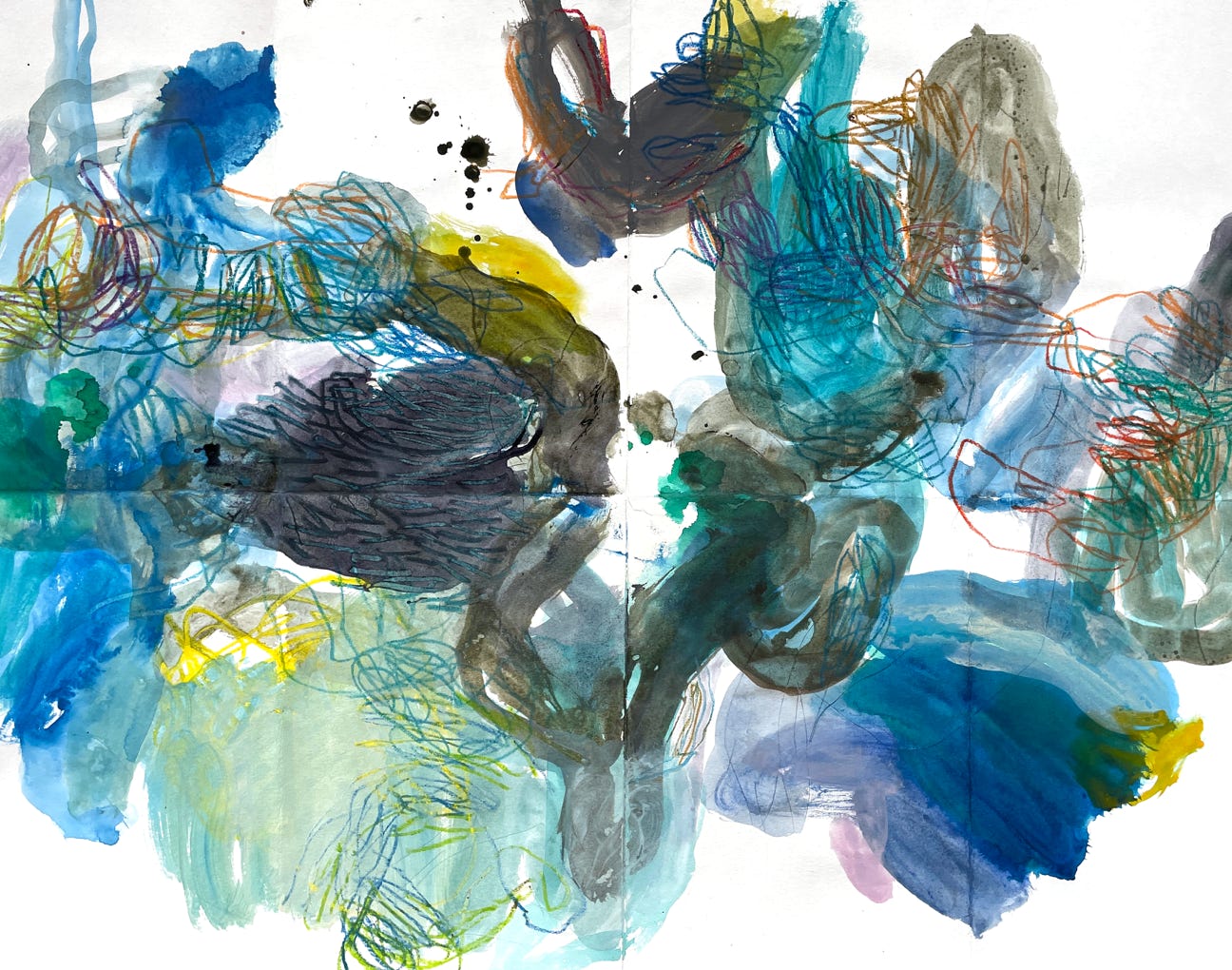 Peinture abstraite, acrylique encre, crayon sur papier, monotypie, pliage